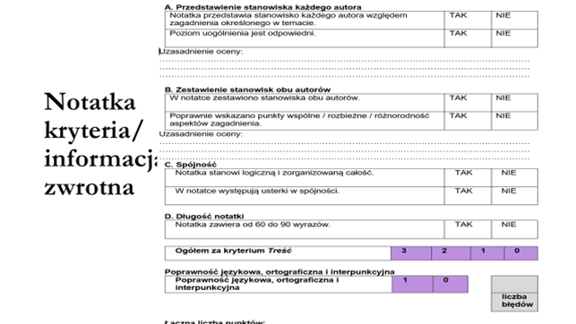 Należy pamiętać o uważnym przeczytaniu i przeanalizowaniu polecenia do zadania. Notatka musi mieścić się w granicach 60-90 wyrazów, musi być zgodna z tematem podanym w poleceniu. Warunkiem koniecznym otrzymania 1 punktu jest właściwe rozpoznanie stanowisk obu autorów i napisanie o tych stanowiskach. Zestawienie stanowisk, czyli pokazanie tego, co wspólne i tego, co inne w stanowiskach, sprawi, że egzaminator może przyznać trzy punkty, jeśli zachowano właściwy poziom uogólnienia i spójność, Dodatkowy punkt otrzymuje maturzystka/ maturzysta, którzy w swojej realizacji nie popełnili więcej niż dwóch błędów językowych.